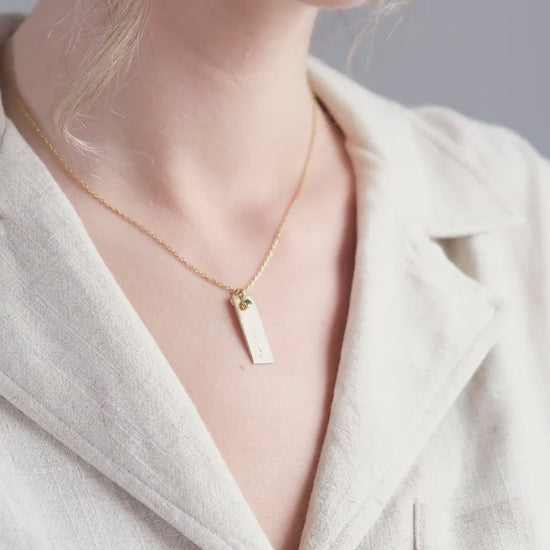 This custom bar necklace is designed to carry what matters most: a name, date, word, or meaningful symbol. Accented with a sparkling birthstone, it's crafted in 925K Sterling Silver / 14K Solid Gold and finished with a sleek, high-polish shine.