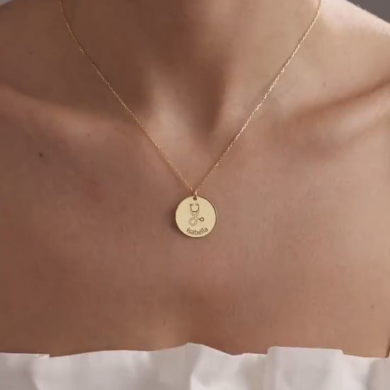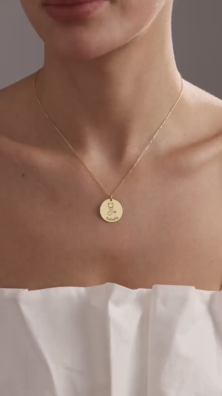 Minimalist round disc necklace with stethoscope engraving and custom name option. A thoughtful gift for nurses, doctors, and medical students.
