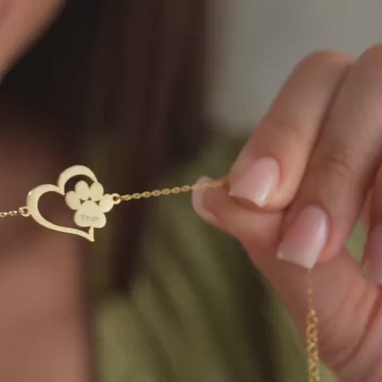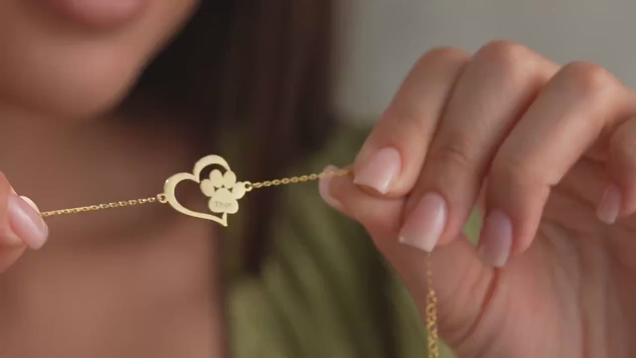 Honor the love you share with your furry friend through our Sterling Silver Paw & Heart Bracelet, featuring a personalized pet name engraved inside a delicate heart silhouette. A meaningful and stylish way to carry your companion with you.